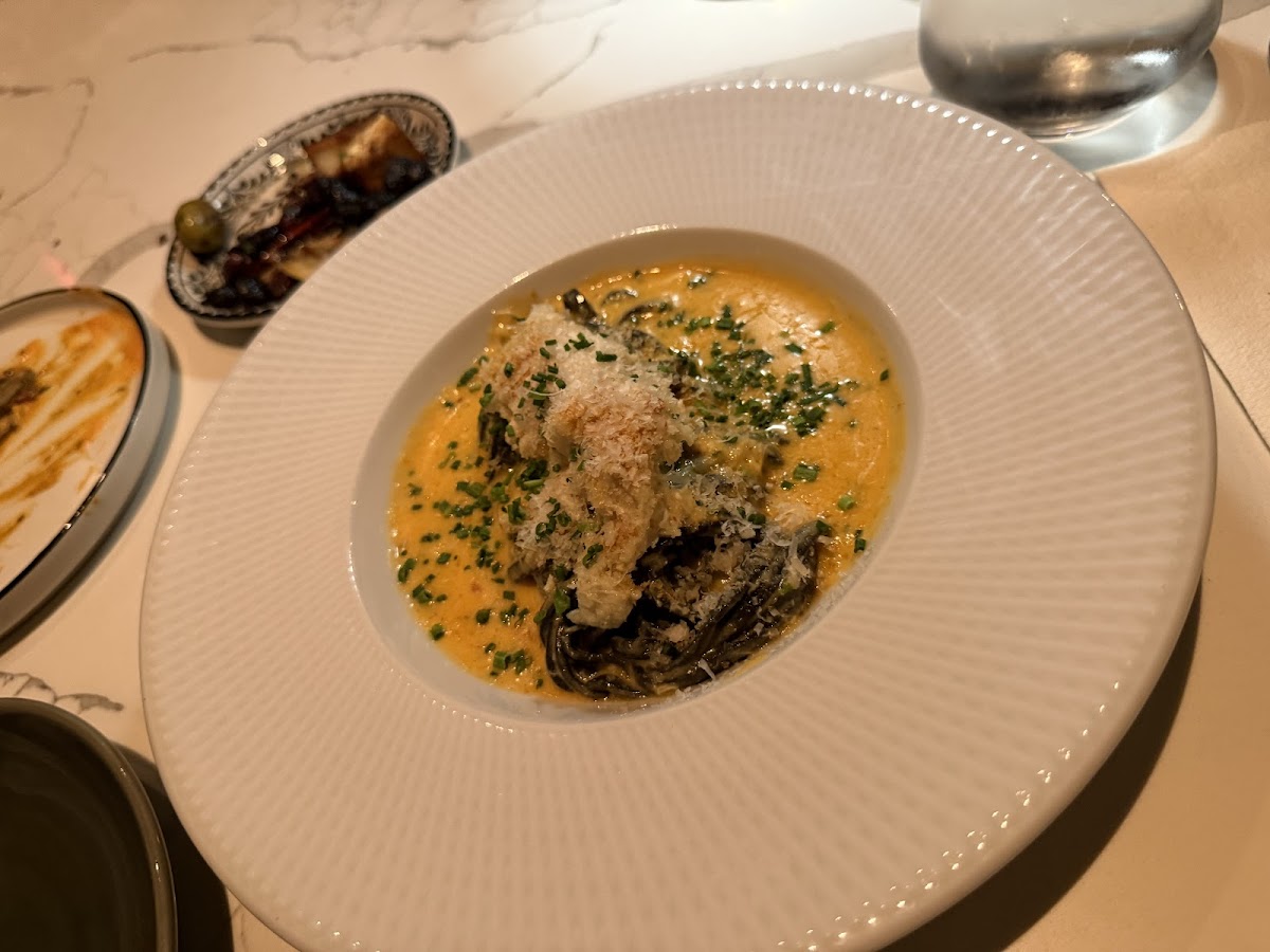 I came to OKTO on a weekday evening with some coworkers, and the first thing that stood out was the ambiance—this place is beautiful. The vibe is perfect for a relaxed evening out, and I could easily see it being a great date night spot, especially once the lights dim in the evening. The bar area, in particular, looks stunning. I started off with the Okto G&T. It was light and refreshing—great for a hot day—but probably not something I’d order again. When it came to food, though, I was really impressed. We ordered a few appetizers to share: • The butternut squash with sour cream was absolutely delicious—surprisingly one of my favorite bites of the night. • The frena (a warm, fluffy pita-style bread) came with olives, pickled peppers, and pistachio butter. It’s a small portion for a group, but the bread was fresh and the butter was amazing. • The octopus wasn’t really my thing—just a personal preference—but if you’re a fan, you might enjoy it more than I did. The highlight of the night was definitely the crab squid ink linguini in a butter sauce. That sauce was insanely good—rich, slightly spicy, and completely addictive. I ended up ordering extra bread just to soak it up. That dish alone makes me want to come back. Overall, I’d give OKTO a strong 4.5 out of 5. The drinks were okay, but the food and ambiance more than made up for it. I probably wouldn’t travel across town just to eat here, but if I’m in the area again, I’d definitely return—especially to try sitting at the bar next time.